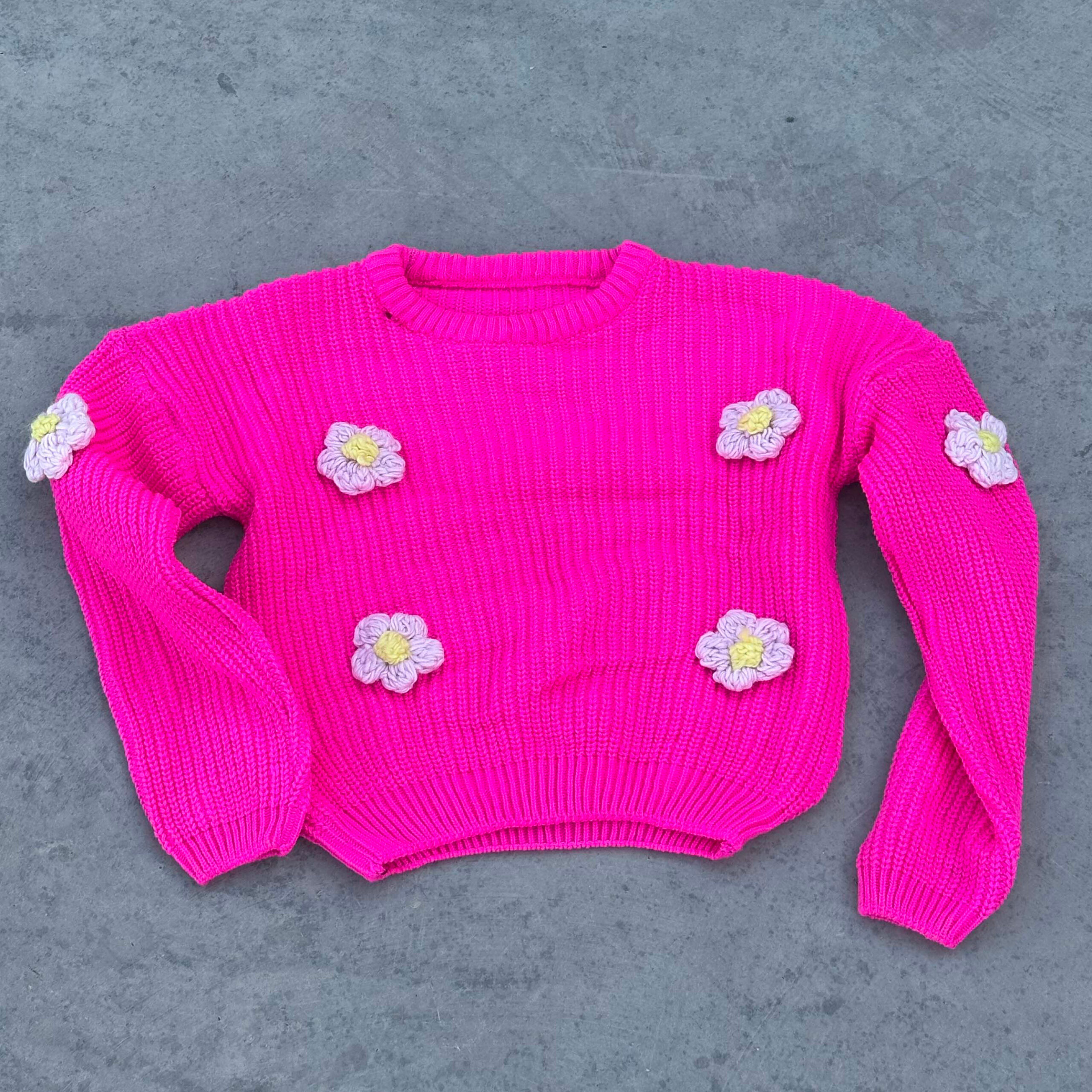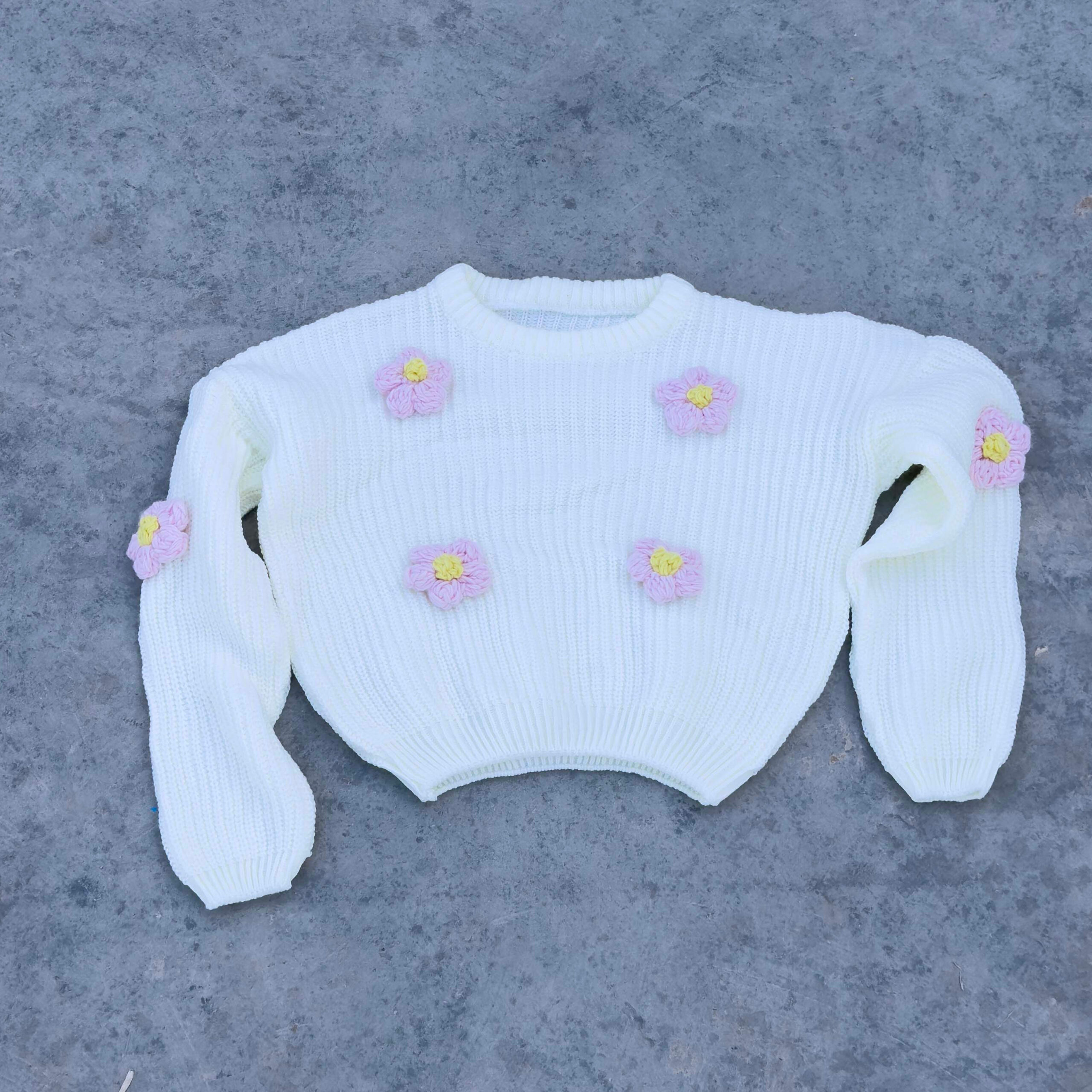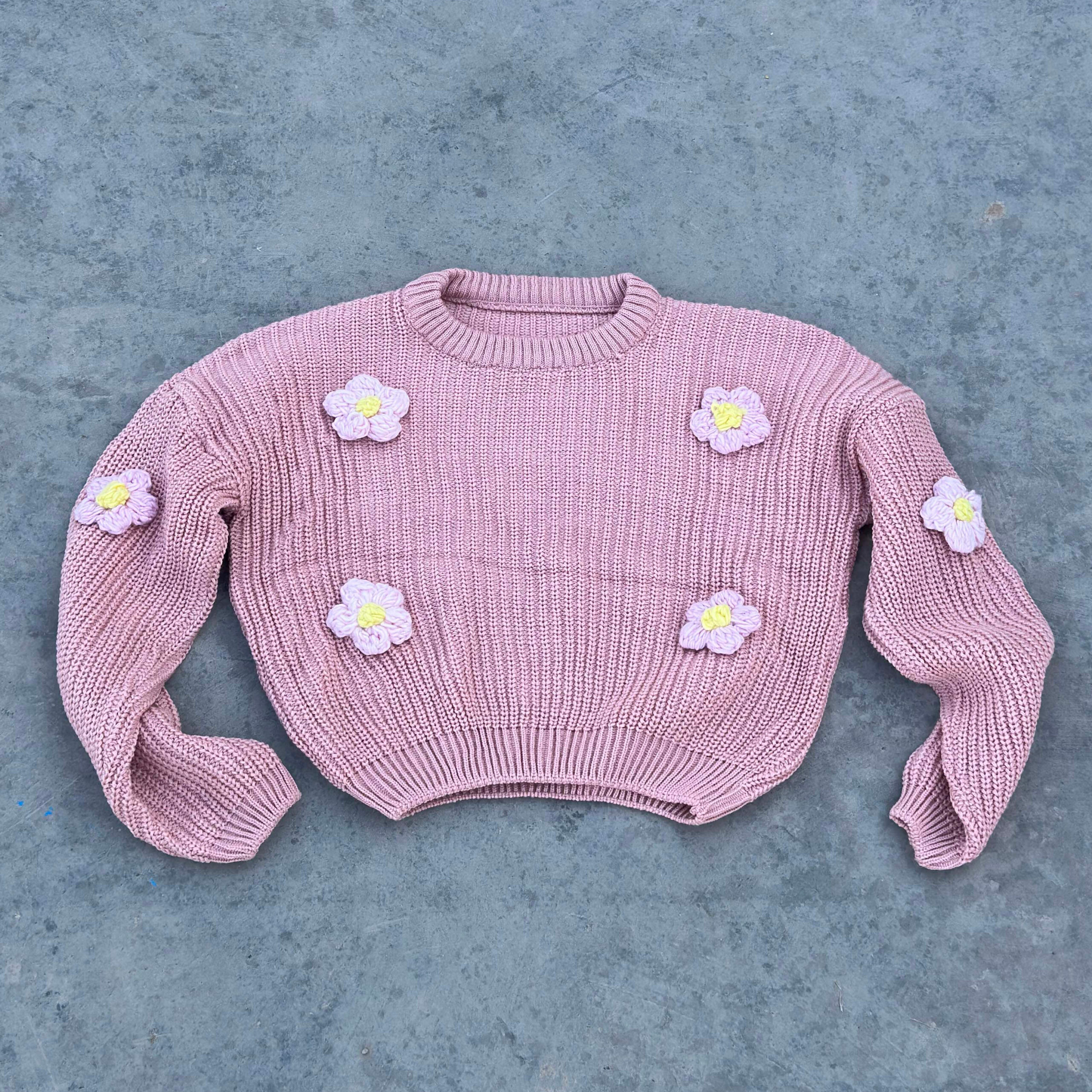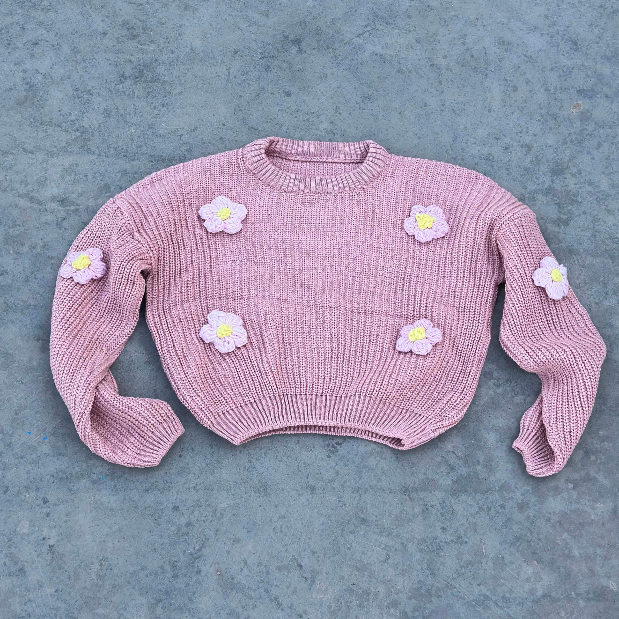 بافت زنانه صورتی گلدار دستبافت با گلهای قلاببافی کار دست. قد کار ۶۰ سانت و دور سینه بدون کشسانی ۱۲۰ سانت. مناسب پاییز و زمستان، استایلی شیک و فانتزی برای خانمهای خاصپسند.